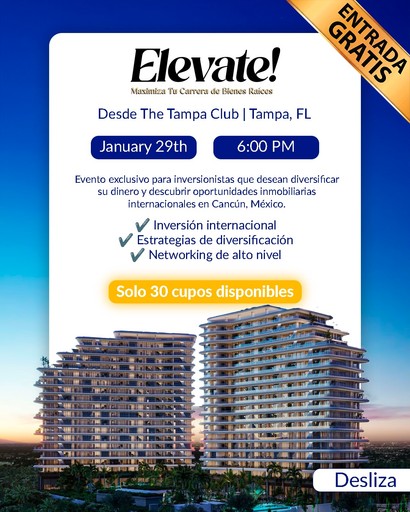 Elevate Cancún es una experiencia exclusiva diseñada para inversionistas que desean diversificar su dinero de forma inteligente, explorando oportunidades inmobiliarias internacionales en uno de los destinos con mayor crecimiento y proyección: Cancún, México.